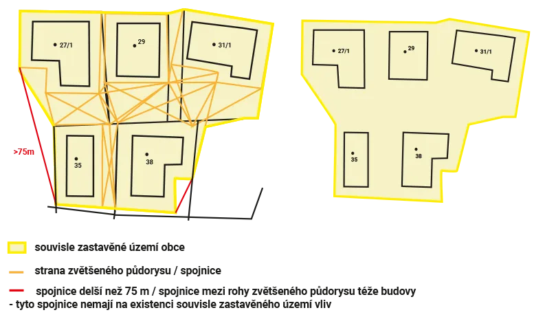 Mezi jednotlivými budovami, jejichž půdorys se pro tyto účely zvětší po celém obvodu o 5 m, nebude spojnice delší než 75 m. Spojnice tvoří rohy zvětšeného půdorysu jednotlivých budov (u oblouků se použijí tečny). Spojnice mezi zvětšenými půdorysy budov, spolu se stranami upravených půdorysů budov, tvoří území.
