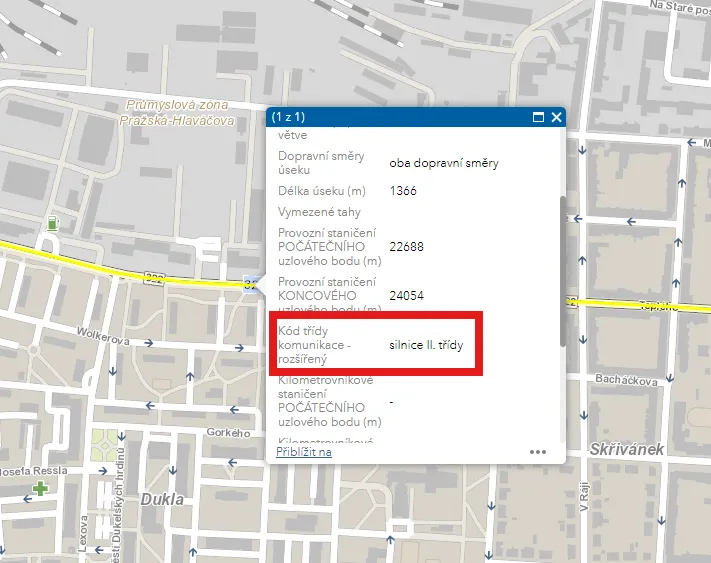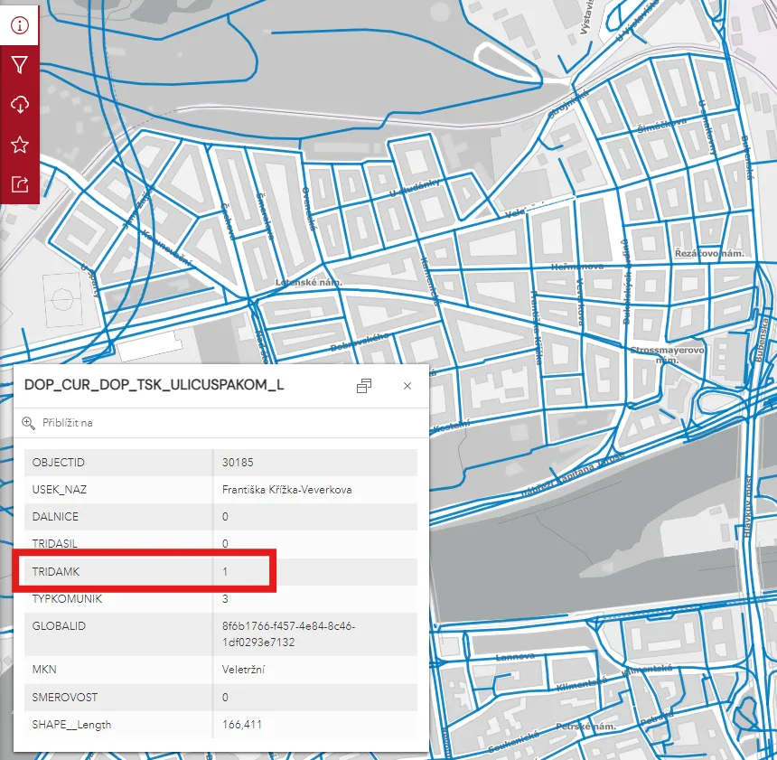 Na území Prahy na Geoportále TSK – po kliknutí na danou komunikaci se zobrazí její detaily, v tomto případě jde o místní komunikaci I. třídy: